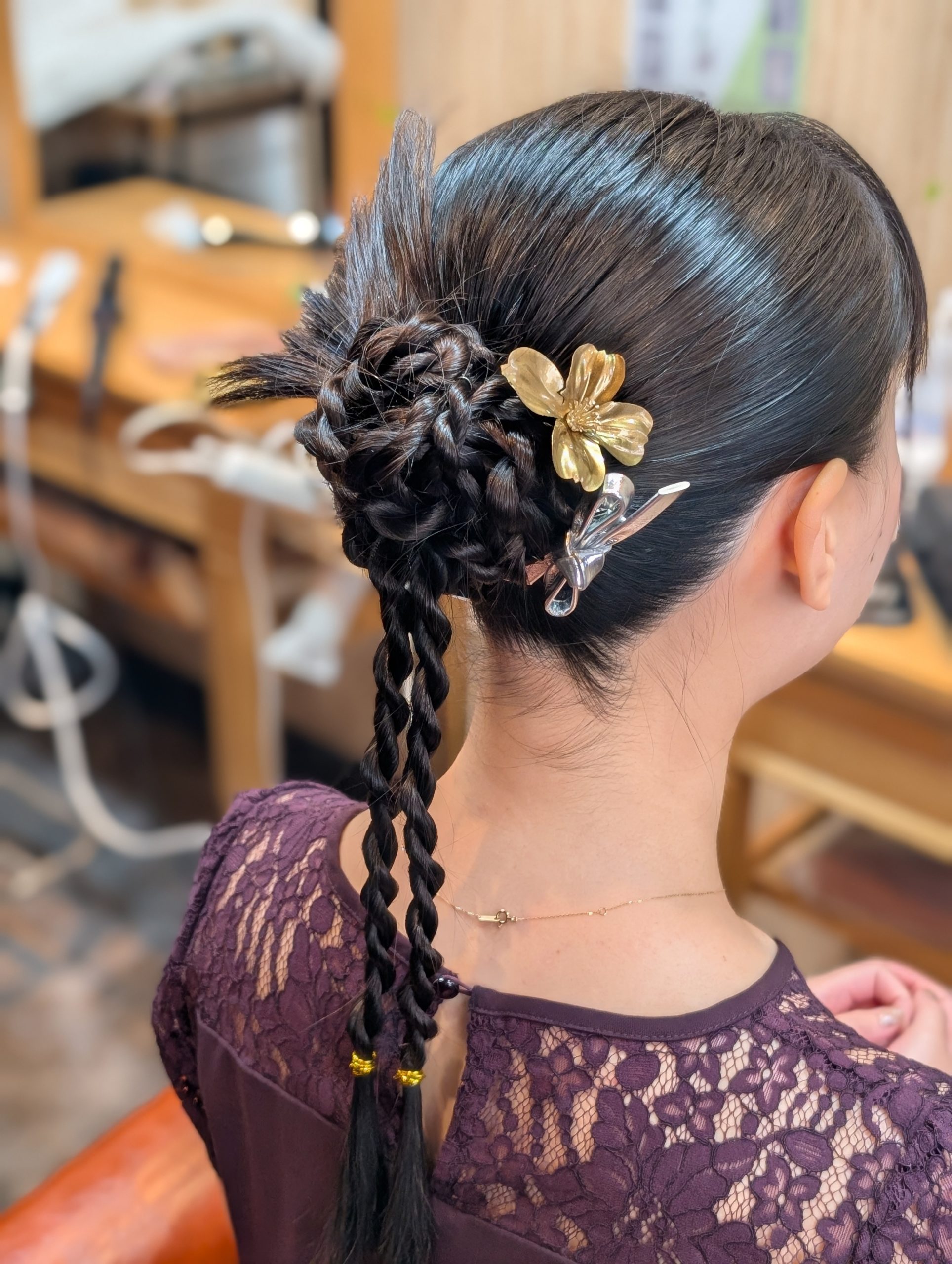 編み込みを組み合わせたまとめ髪で後ろ姿も華やかに